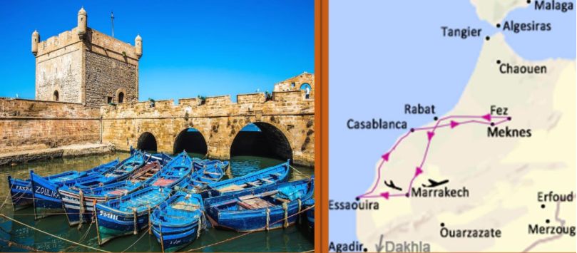 Marrakech, Essaouira, El Jadida, Casablanca, Meknes, Fez, Rabat, Ait Benhaddou, Zagora, Nkob, Tazzarine, Erfoud, Tinghir, Ouarzazate, Marrakech